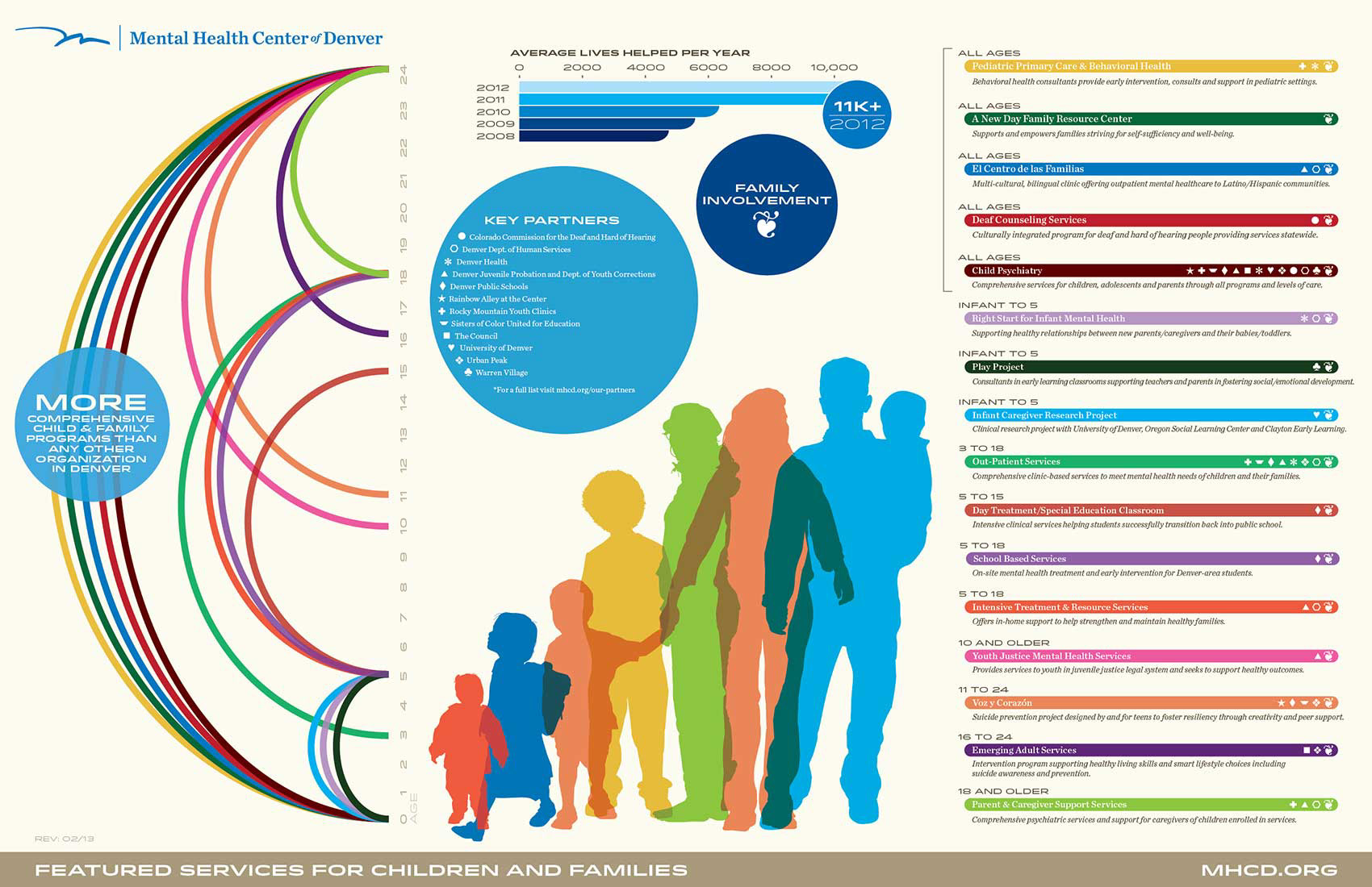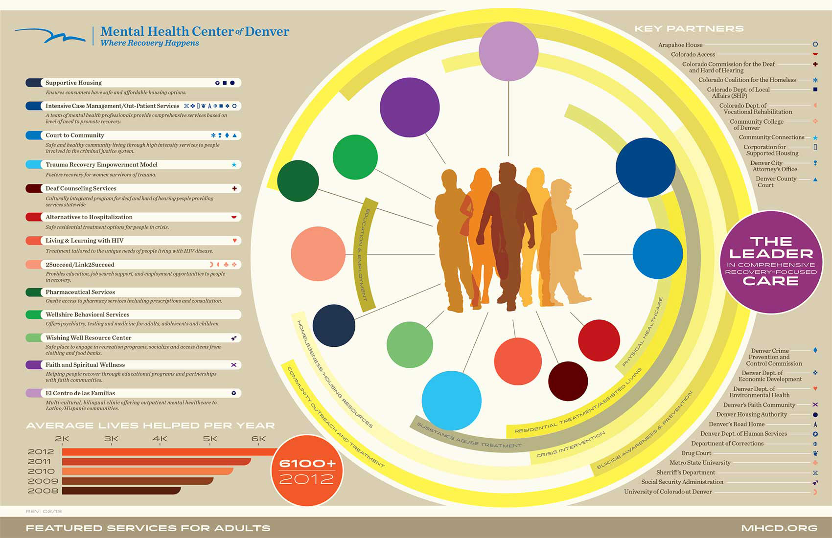 Infographics representing the service channels and spectrum of resources they provide at the Mental Health Center of Denver.